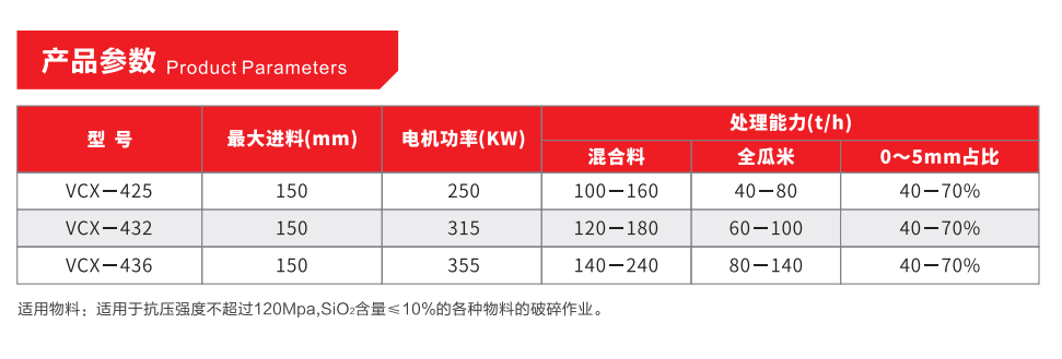 Suitable materials: limestone and other compressive strength is not more than 120Mpa,SiO? content ≤10% of all kinds of materials crushing operation.